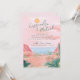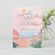 This destination wedding invitation features painted artwork of a Mexican desert beach scene. All the important wedding details can be personalized. Colors include green, pink, white and coral. Text in green.