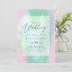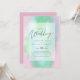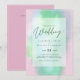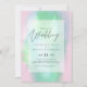 Modern wedding invitation featuring text template fields on both sides and a cloud of greeny blue colour.