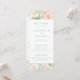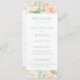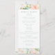 Elegant pastel pink, peach, teal floral wedding program cards showcasing delicate watercolor peonies and simple minimalist calligraphy script in mint colour. Perfect for botanical garden outdoor celebration.