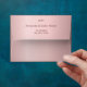 A faux dusty rose, pink metallic looking background. Personalise and add your monogram initals, name and address. Your monogram as a pattern inside. Your family name's initial in the middle with a capital letter. The names are written with a modern and trendy handlettered style script. Dark rose gold coloured letters. Perfect for wedding invitations and thank you cards!