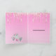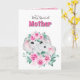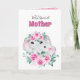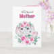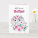 A beautiful illustration of a cute cartoon mother elephant with pink ears clutching her calf to her chest. She has beautiful pink roses on her head and is sitting in a rose bouquet with green leaves. The little baby has a pink ribbon bow and rose flower tied to her little ear. The words, to a very special mother (which may be changed to mum, mum, mummy, mummy, daughter etc) appears on a white background and the inside has a template for your personalised message set against a soft pastel pink faux glitter background.
