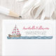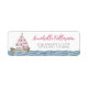 This sweet return address label features a playful pink and white sailboat sailing across gentle ocean waves, with a soft wave pattern in the background. A mix of pink and grey fonts combines script and serif typography for a charming and elegant look. Perfect for baby shower invitations or thank you notes, it works beautifully with nautical themes like "Baby on Board" and "Anchors Away."