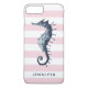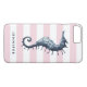 Dress you new phone with this preppy chic striped case featuring a blue illustration of a vintage seahorse in blue over a nautical stripes in feminine pink colour.
