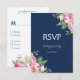 Elegant and sophisticated, yet romantic and sweet Watercolor Pink Peonies, Pink Roses, and pale green Greenery on Navy Blue Wedding RSVPs. Personalise with your own information.