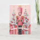 Celebrate the holiday season with this charming card featuring a pink nutcracker standing proudly in front of festive Christmas trees and beautifully wrapped gifts. The "Merry Christmas!" message adds a cheerful touch to the whimsical and playful design, perfect for sending holiday greetings to friends and family.