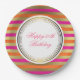 Birthday paper plates with an elegant pattern composed of pink, orange and faux gold metallic horizontal stripes. A white circle with a gold gradient border design layered across the centre with your text in the middle.