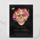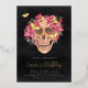 A spooky chic Halloween birthday party invitation featuring a floral skull illustration topped with pink orchid watercolor flowers on a smoky black background. Personalise this unique and elegant Halloween birthday party invitation with your event details in off-white lettering.