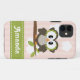 Personalise this cute and stylish custom owl design with your name on the lime green contrast stitch ribbon design. An adorable wide eyed owl sits perched on a leafy branch against a fluffy cloud and pink stripe background. Artwork © Chrissy H. Studios, LLC. All Rights Reserved.