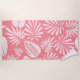 Get the party started with these cute beach towels that are easy to personalise for your bachelorette party, hen night, or girls' weekend! Modern party style design features a pattern of white palm leaves on a pink background with bold pink lettering. Personalise with three lines of custom text; shown with the bride's name, event type, location and date. All text can be edited per your liking.
