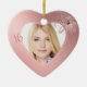 Here's a wonderful way to commemorate that 16th birthday for her, and it's appropriate for Christmas and all through the year, too! This keepsake Sweet Sixteen ornament has her photograph on the front, enclosed within a pretty gradient pink heart shaped frame. At the top right corner is a glittery pink peacock feather. The number "16" is on the left side of the frame. The back of the ornament has the same pink heart shaped frame and peacock feather, but with a white heart shape at the center that holds your custom text. A faux pink jewel strand at the bottom finishes off the design. All the text, front and back, is customizable, and you may delete any portion of it by clearing the text field. Special for her for that special day!