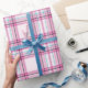Brighten your gifts with this cheerful plaid featuring candy-inspired pink and teal lines on a soft background. This wrap brings a sweet and whimsical twist to traditional plaid, ideal for the festive season.