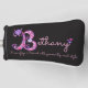 Pretty drawing of B monogram name and meaning golf cover. Ideal for a personalised gift for a girl who has a name beginning with B. This example reads Bethany House of figs. Blessed generosity and style or you can customise the text with your own name and definition words if required. Ideal as a special birthday or celebration gift to a female golfer. If you need help with your own personalised name please contact me. Capital letter B typographical hearts and flowers drawing and graphic conversion in shades of pink, purple, white and navy blue uniquely created by Sarah Trett. www.sarahtrett.com for www.mylittleeden.com