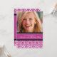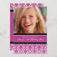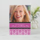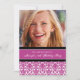 Custom Photo 20th Birthday party invitations in elegant bright fuchsia pink, black and white classic floral damask pattern. Add your name, photo, and party details for a unique and stylish 20th birthday party invitation.