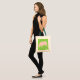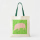 This design features a cartoon style pink pig. It has its head down ready to gobble up whatever food it can find. The background is a mixture of different shades of green to create the impression of grass. It is shown here on a budget tote bag with a green handle but is also available on several other colours and styles of bag.