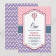 Invite your friends and loved ones with this pink and lavender hot air balloon 1st birthday party invitation which is decorated with polka dots and chevron stripes.