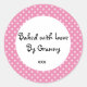 Pink Polka dot 'baked by Granny' sticker. design features a pretty pink and white polka border with the message 'baked with love by granny' in black fun font, with some kisses added at the end! perfect for sealing those cookies from Granny to family and friends! You can change the wording, font and colour in the customise menu!