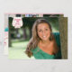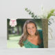 This graduation party announcement has a trendy pink and white mini polkadots pattern in the background on the back. At the top on the backside, you can personalise this with three of your photographs. At the bottom, you can customise the text to be an invite/announcement of a graduation ceremony or a party to celebrate the graduation. On the front, you can add another photograph of the graduate. On the top left, there is a stylish hot fuchsia pink swirl badge with Class of 2012 written. You can customise the year to be whatever year you are graduating. This graduation announcement has a total of 4 photos that you can add, 3 on the back and 1 on the front.
