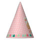 This fun gingerbread house party hat is the perfect way to celebrate a birthday during the holidays. A classic pink with white polkadot background and a border of gumdrops make this party hat extra sweet. The front of the hat features a gingerbread house with all the cute frosting details.