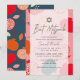 This stylish and kitsch Bat Mitzvah invitation features a pink background with a pomegranate pattern in red, orange and navy blue. The reverse side features a navy blue background with a pomegranate pattern. Personalize it for your needs. You can find matching products at my store.