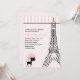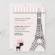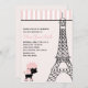 Adorable birthday party invitations features a cute vector illustration of a pink and black french poodle and the Eiffel Tower on a pink and white stripes pattern background.