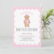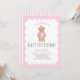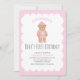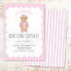 This design features a preppy bear birthday themed "Bear'y First Birthday" with a cute teddy bear in pink baby outfit, scalloped borders and striped pink and white backside. Perfect for a baby girl's first birthday party. This product can be easily personalised.