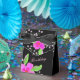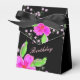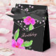 Pretty little flowered tent style favour box, personalise the light pink text, or text is removable. Ideal for party, wedding guests, birthday parties, or corporate events. Rich black background which can be switched to your own colour choice with bright coloured flowers. Designer party favours with your own personal message.