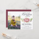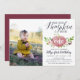 Fall in love with these adorable rustic kids birthday party invitations featuring a favourite photo on the left side. Design features a pink watercolor pumpkin adorned with burgundy and pink flowers and green foliage. "Our little pumpkin is turning" appears across the top in chic calligraphy script lettering, with your child's age inscribed on the pumpkin. Sample shown for a first birthday. Personalise with your birthday party details beneath in rich navy blue lettering.