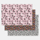 A set of wrapping paper sheets for Halloween featuring three patterns in matching styles: ghosts, skulls, ravens, bats and cats in pink, white, orange, and black; happy pumpkins and mushrooms with spiderwebs; and lots and lots of ghosts. Fun and kid friendly pink, black, and orange Halloween wrapping paper set for Halloween girl baby showers, Halloween girl birthday parties, and Halloween costume parties or any other fun and spooky Halloween event. Girl Halloween wrapping paper set for all your fun Halloween events in a pink and purple version of the Halloween palette.