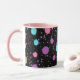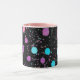 Black background with purple, pink and blue polka dots seamless repeat pattern design