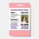 A pink and purple colour scheme, plus solid all-caps fonts add importance and ease of readability to this emotional support animal name badge. Personalise with ESA name, handler name and address, plus registration # and upc code. Font type and font colours can be modified as desired.