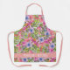 Cute and girly all-over-print apron with a pretty pink and purple flowers and green leaves print. Text says, "YOURNAME kitchen" Personalise with your name or any text you choose.