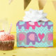 Elephants of purple and pink with pink and grey hearts on a blue polka dot background, a cute, fun wrapping paper perfect for birthdays or other occasions!