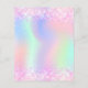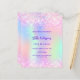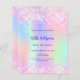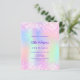 A girly and feminine 18th birthday party invitation. On front: A rainbow, holographic coloured background in purple, pink, mint green. Decorated with blush pink confetti. Personalise and add a name and party details. The name is written with a hand lettered style script, purple coloured letters.