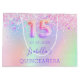 A gift bag for a girly and glamourous Quinceañera, 15th birthday. A holographic background in pink, purple, and mint green with confetti. Number 15 is written with a balloon style font. Perfect as a party favour bag or as a gift bag.
