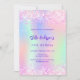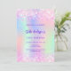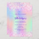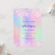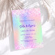 A girly and feminine 18th birthday party invitation. On front: A rainbow, holographic coloured background in purple, pink, mint green. Decorated with blush pink sparkles. Personalise and add a name and party details. The name is written with a hand lettered style script, purple coloured letters.