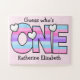 Celebrate a lovely First Birthday with this sweet design! Features a soft pink background and the words 'ONE' in stripes of pink, purple, and blue. This design is easy to match with decorations making for a perfect birthday party celebration!