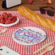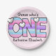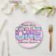 Celebrate a lovely First Birthday with this sweet design! Features a soft pink background and the words 'ONE' in stripes of pink, purple, and blue. This design is easy to match with decorations making for a perfect birthday party celebration!