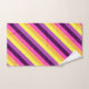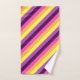 A set of bath towels featuring a cute, colourful pattern design of diagonal stripes in plum purple, lavender, lemon yellow, melon orange, and bright magenta.