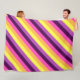 A large sized fleece blanket featuring a cute, colourful pattern design of diagonal stripes in plum purple, lavender, lemon yellow, melon orange, and bright magenta.