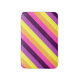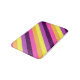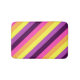 A small sized bath mat featuring a cute, colourful pattern design of diagonal stripes in plum purple, lavender, lemon yellow, melon orange, and bright magenta.