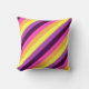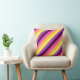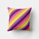 A 16” x 16” throw pillow featuring a cute, colourful pattern design of diagonal stripes in plum purple, lavender, lemon yellow, melon orange, and bright magenta.