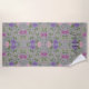 Soak up the sun in style with this beautiful Personalised Floral Beach Towel. Featuring a vibrant and mirrored arrangement of purple and pink flowers with lush green leaves and pistachio dots, this towel also offers a space to add custom text or a name, making it uniquely yours. The soft grey background allows the colourful floral design to pop, creating a chic and eye-catching beach accessory.