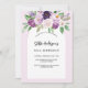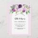 A blush pink background and a white arch frame. Decorated with violet, purple and pink watercolored flowers and greenery. Personalise and add your name and party details.