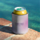 Create a sleek, modern can cooler design featuring a chic gradient of pink, purple, and white. The minimalist aesthetic is complemented by customizable black typography for a professional touch.