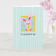 This card features a stylized pink bunny 🐰 with rosy cheeks, tiny black dot eyes, and fine black whiskers, looking straight ahead with a gentle, friendly expression. Bright fuchsia details color the inner ears and paw pads, adding a cute contrast to the soft pink body. The bunny’s front paws cradle a lemon-yellow oval decorated with small sky-blue polka dots, like a little gift held close in a caring hug. Behind the character, a golden-yellow square frame surrounds a calm sky-blue panel, giving the central scene a tidy, focused look. The outer background is pale mint green with slightly uneven vertical white stripes that resemble a softly painted texture. Beneath the framed illustration, a short line of text sits centered in warm orange, written in flowing cursive-style lettering. The pastel palette and the bunny’s tender, holding posture give the design a sweet, affectionate tone 🌷. The golden frame, blue panel, and dotted yellow oval stand out crisply against the mint-and-white striped backdrop.