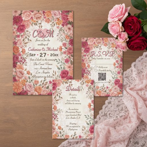 Complete your invitation suite with this beautifully coordinated wedding details card. Framed by romantic watercolor florals in blush pink, dusty rose, wine red, and soft peach tones, the design captures the charm of a blooming spring garden. The delicate botanical border keeps the layout elegant while allowing your important information to remain clear and easy to read.