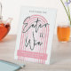 Retro pink Raffle sign with trendy fonts, light pink arch background. Use this girly 'enter to win' table top sign for your next corporate or private prize draw, whether it's a business event raffle or a baby shower game, this pedestal sign can suit any type of raffle!
