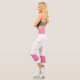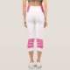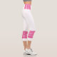 Two-tone design with pink retro style stripes on the lower legs. Horizontal lines in Cyclamen pink on a white background for your sporty Capri leggings. Add a personal touch to your outfit with your name on the left side of these high-waisted athleisure leggings.