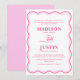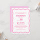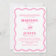 This Pink Retro Wavy Wedding Invitation brings a nostalgic yet contemporary vibe with its playful curves and squiggle accents. The hand-drawn calligraphy, combined with a bold pink and red colour scheme, adds a stylish retro touch to your wedding stationery. Perfect for couples who love vintage charm, this wavy invitation design captures the essence of a retro wedding with a modern twist.