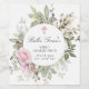 A modern botanical wreath is decorated with pink roses. The First Communicant's name is written in a large script font. First Communion and a thank you sentiment follow.